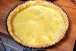 Klop de eieren los met de crème fraîche en tijmblaadjes en breng op smaak met zout en peper. Snijd de brie in lange plakken en leg deze op de bodem van de voorgebakken taartbodem.