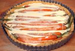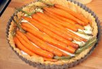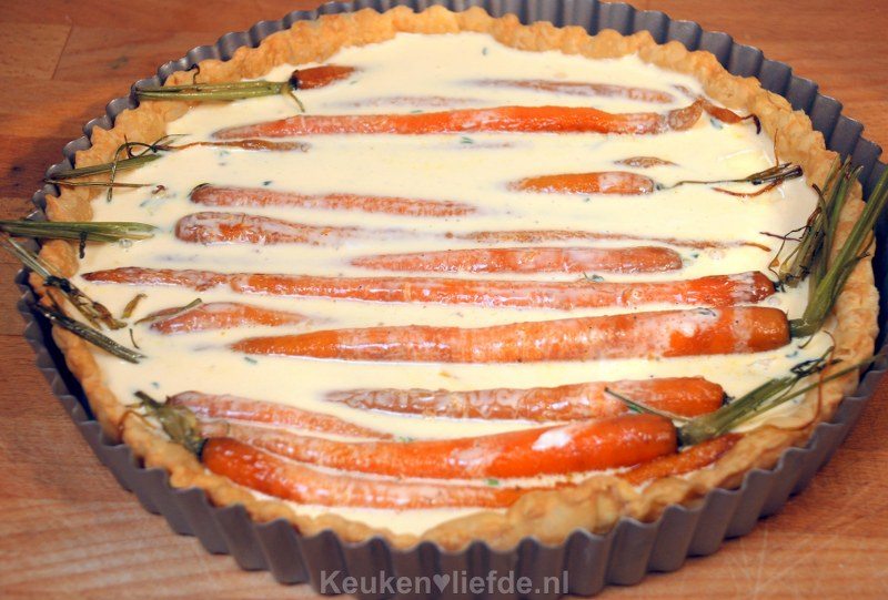 Verdeel de geglaceerde wortels over de brie en de taartbodem en schenk tot slot het eiermengsel eroverheen.