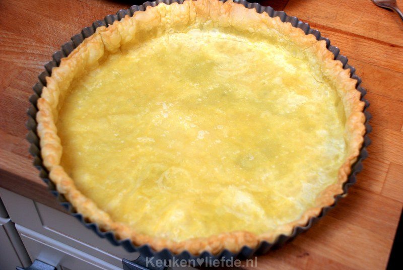 Verwarm de oven voor op 180 graden. Laat de vellen bladerdeeg ontdooien en bereid en bak de bodem op dezelfde manier als in dit recept.