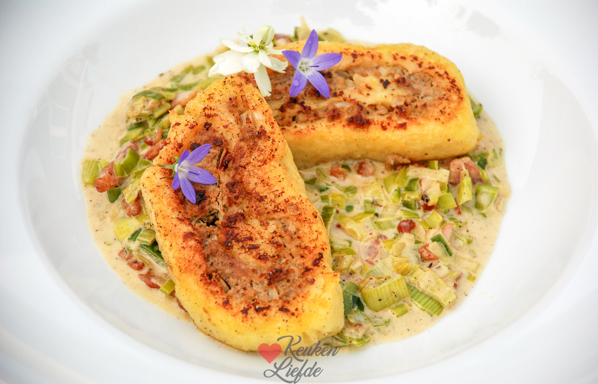 Serveer de gehaktrol op een bedje van gesmoorde prei in spek-roomsaus en geniet van je feestmaal.