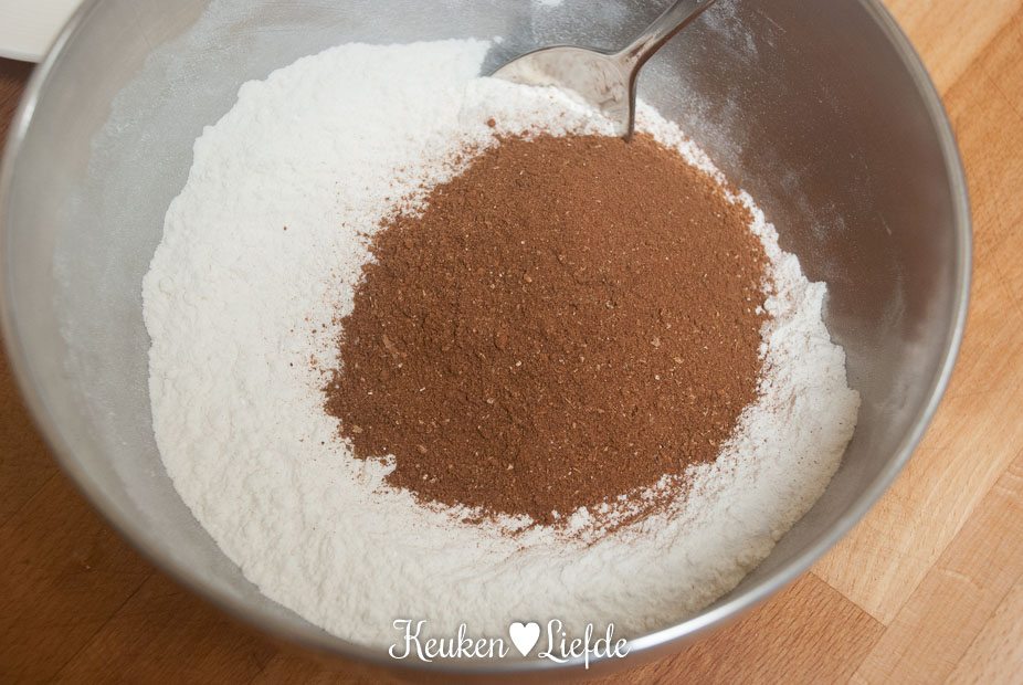 Roer de bloem, bakpoeder, zuiveringszout, specerijen en zout in een kom door elkaar.
