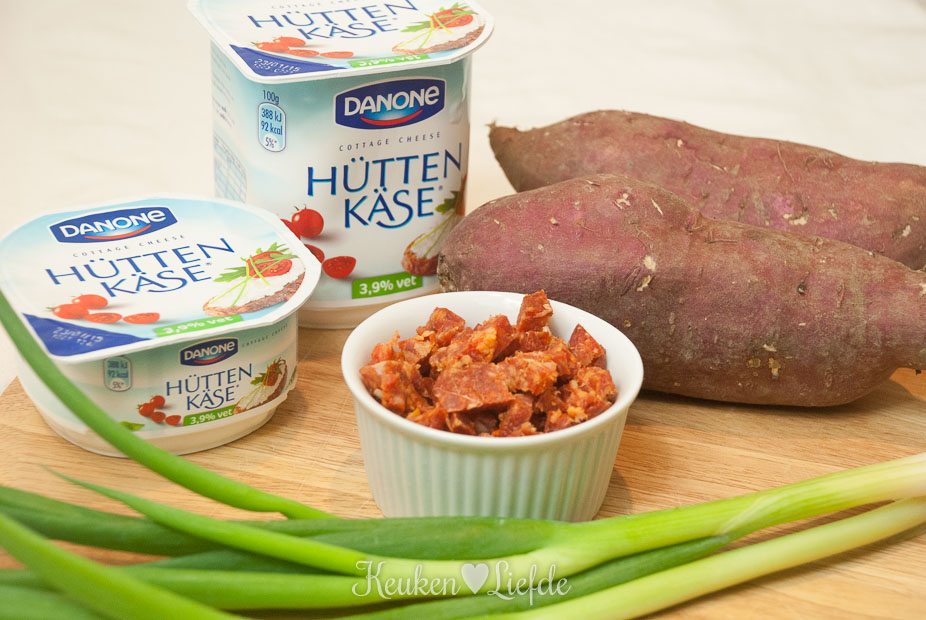 Al jarenlang ontbijt, lunch of snack ik rijstwafels met Hüttenkäse. Door de neutrale smaak kun je er eindeloos mee variëren zodat het nooit verveelt (de rijstwafeltaartjes met Hüttenkäse, komkommer, sla, tomaat, radijs en vers geknipte bieslook zijn mijn favoriet!). Maar hoewel ik Hüttenkäse meestal koud eet, kwam ik onlangs tot de ontdekking dat je hem ook voor warme bereiding kunt gebruiken. I like! In dit gerecht combineer ik Hüttenkäse met gepofte zoete aardappel, pittige chorizo en frisse lente-ui. En wauw, wat is dat lekker! Bovendien is het echt supermakkelijk om te maken, want de oven doet al het werk. Yes! We hebben er weer een nieuwe favoriet bij.