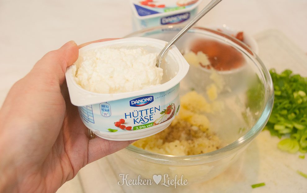 - 1 bakje Hüttenkäse à 200 gram. (Maak je dit gerecht voor meer dan 2 personen, gebruik dan de verpakking van 400 gram)