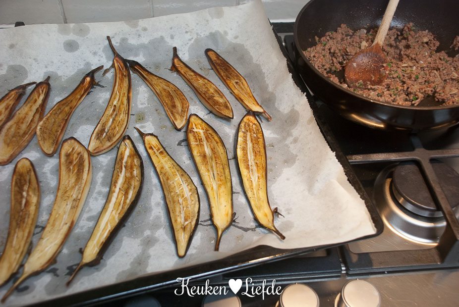 Leg de aubergines op een met bakpapier bekleed bakblik en bestrijk het vruchtvlees royaal met olijfolie, herhaal dit totdat de aubergine geen olie meer opzuigt. Bestrooi ze met versgemalen zout en peper en bak ze circa 35 minuten in de oven, of totdat ze goudbruin zijn en het vruchtvlees zacht is. Haal ze uit de oven, maar laat de oven aanstaan.