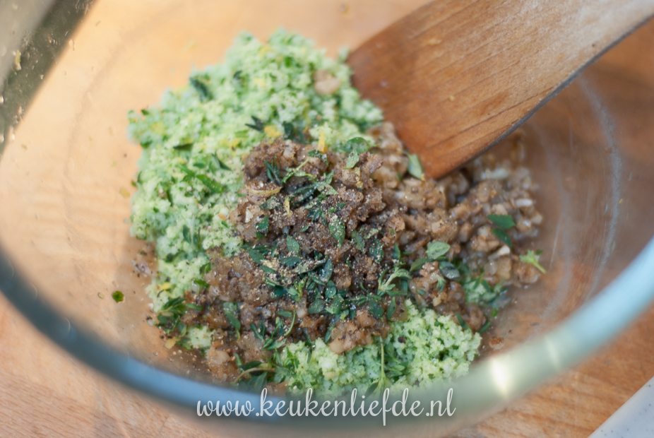 Ik maak een vulling van broodkruim, crème fraîche en lekkere smaakmakers zoals peterselie en tijm. Simpel, goedkoop en lekker!