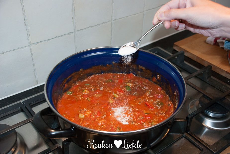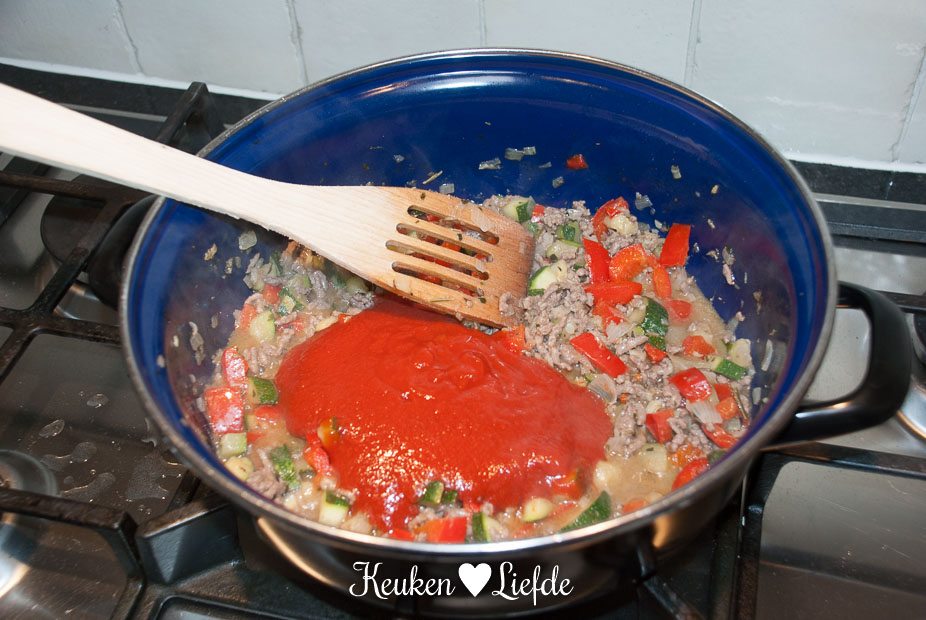 Verhit een grote koekenpan of hapjespan met wat boter of olie en fruit de ui, knoflook, kruiden en groenten, totdat ze zacht maar niet gekleurd zijn. Voeg het gehakt toe en bak rul. Breng goed op smaak met peper en zout. Blus af met een scheut witte wijn en laat even inkoken. Voeg de gezeefde tomaten toe, vul het lege pak voor 1/3 met water, schud krachtig om en voeg ook toe. Breng de saus goed op smaak met zout, peper en een snuf suiker. Laat de saus een minuut of vijf zachtjes pruttelen.