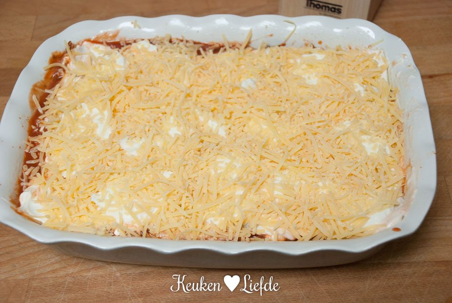 Bereid de lasagnebladen zoals aangegeven staat op het pak. Verwarm de oven voor op 180 graden. Vet de ovenschaal in. Maak laagjes in de ovenschaal van achtereenvolgens wat tomatensaus, oude kaas en lasagnebladen. Herhaal tot alle ingrediënten op zijn, eindig met de crème fraîche, mozzarella en de overige oude kaas.