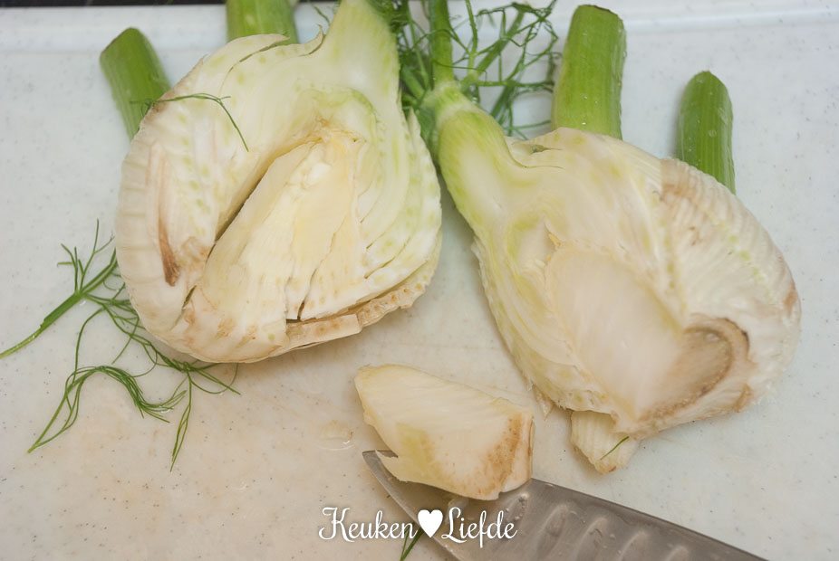 Pel de sjalotten, halveer over de lengte en snijd in ragfijne plakken. Verwijder het hart (harde gedeelte uit de onderkant) uit de venkel en snijd de rest in flinterdunne repen. (De harde groene stengels mogen weg, maar bewaar wel wat plukjes venkelgroen voor de garnering.) Pel de knoflook en snijd in flinterdunne plakjes. Halveer de peper over de lengte en verwijder de zaadlijsten. Hak de peper fijn. Halveer de kerstomaten.