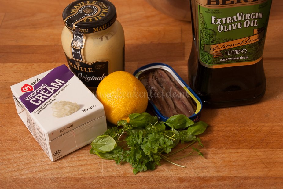 - 1 takje basilicum, dragon of munt (alleen de blaadjes), fijngehakt