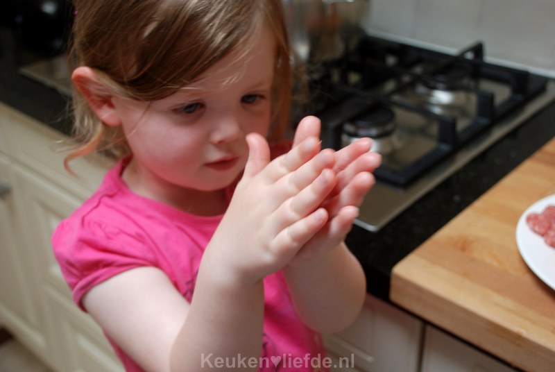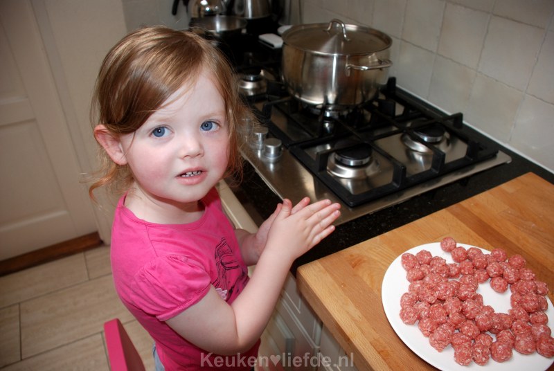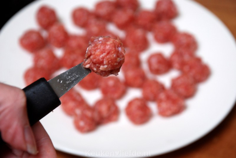 Ik gebruik meestal een kleine parisienneboor om het gehaktmengsel af te meten. Zo worden alle gehaktballetjes even groot.