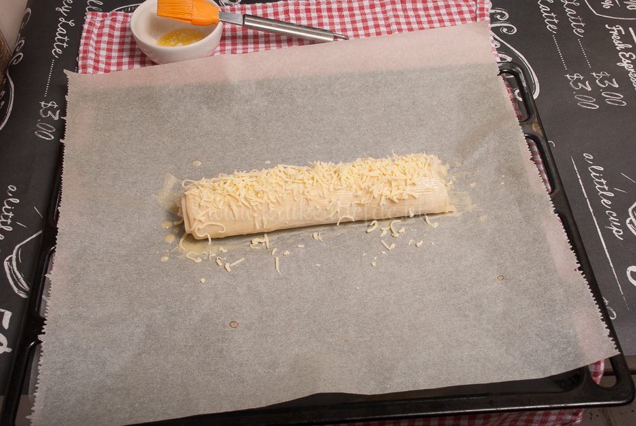 Vouw de zijkanten van de rol naar binnen. Rol strak op vanaf de kortste kant. Bestrijk de bovenkant van de rol met de overige boter en bestrooi met de overige kaas. Leg op het bakblik en bak circa 15 minuten in de oven, of totdat de bovenkant goudbruin is.