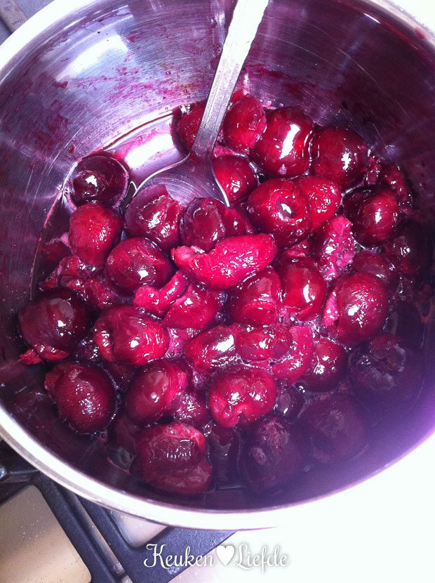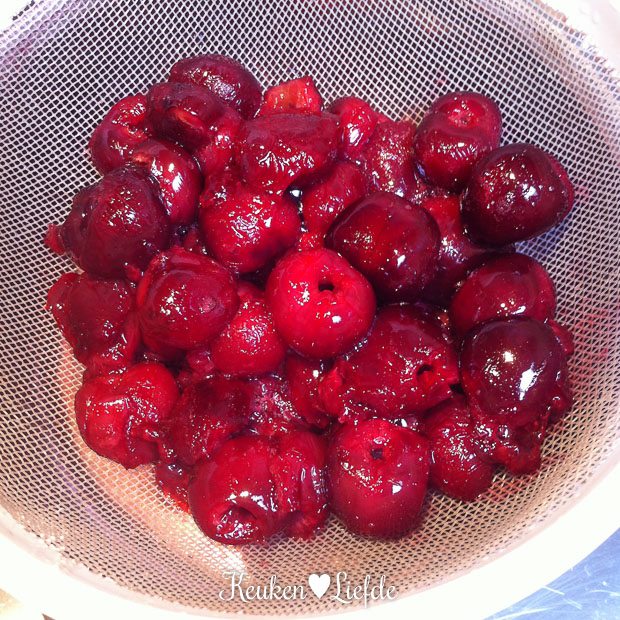 Ontpit de kersen en verwarm ze samen met het citroensap en één eetlepel suiker in een steelpannetje op middelhoog vuur. Verwarm enkele minuten, totdat de kersen openbarsten en het sap vrijkomt. Laat de kersen uitlekken in een zeef en vang het kersensap op. Laat afkoelen.
