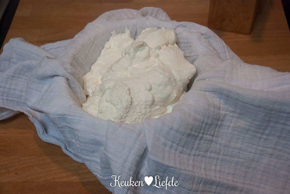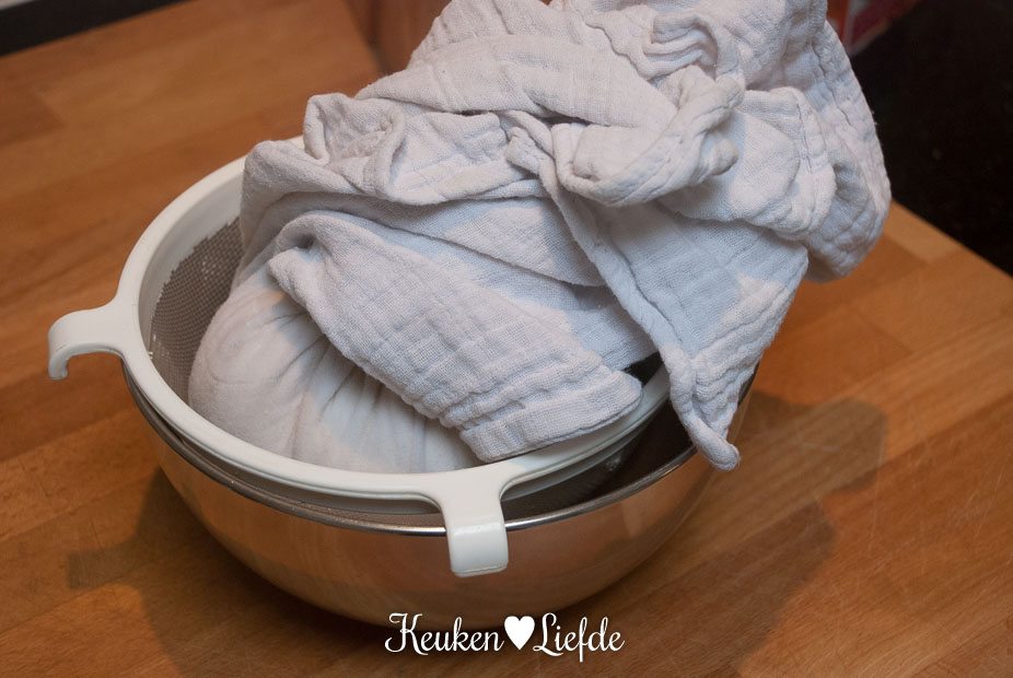 Zet het vergiet op een kom en bekleed met de theedoek. Schep de yoghurt in de zeef en draai de theedoek dicht.