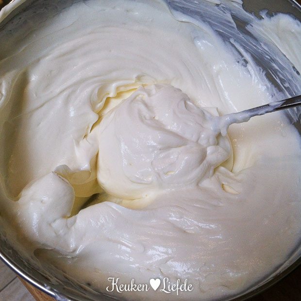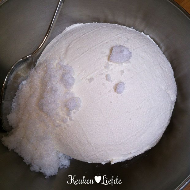 Zet weg in de koelkast en laat de yoghurt uitlekken, het liefst een hele nacht. (Zorg ervoor dat de yoghurt, niet in aanraking komt met het uitlekvocht, pak anders een hogere kom.) Roer de uitgelekte yoghurt — dit noem je hangop — in een kom los met één a twee (naar eigen smaak) eetlepels basterdsuiker.