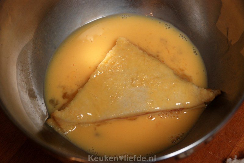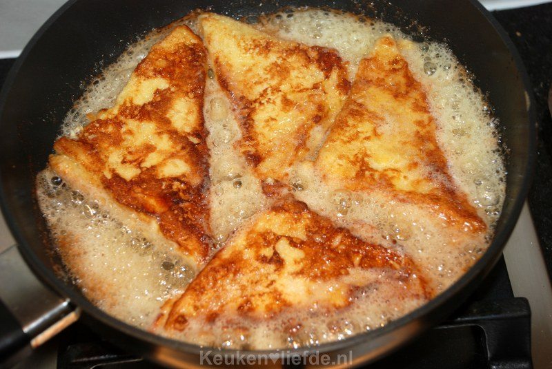 Verhit de koekenpan met wat boter of olie. Wentel het brood door het ei beslag en bak ze aan beide kanten goudbruin in de koekenpan.