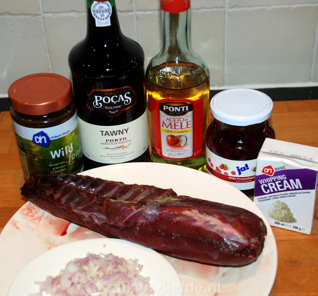 Leg het vlees op een bord en schenk de portsaus eroverheen. Serveer er verder in de oven gebakken en met veenbessen gevulde appels bij en wat aardappelkroketten of frietjes.