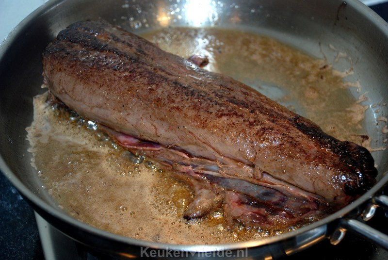 Ik heb de haas snel om en om gebraden en meteen in een schaal, thermometer in het vlees dan in de oven