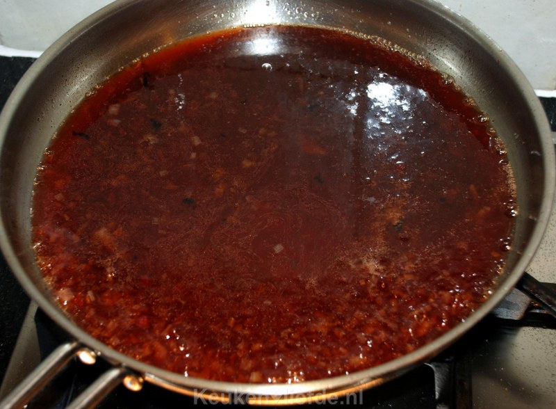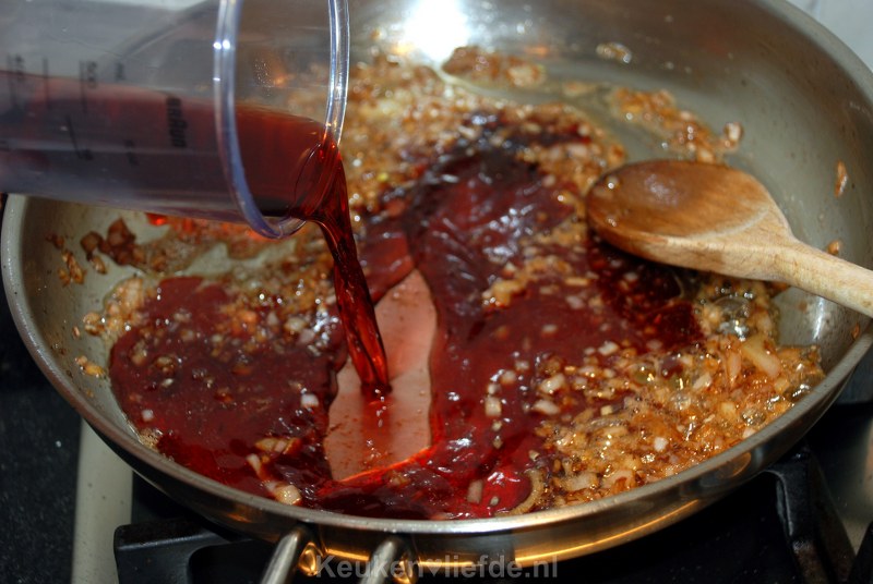 Laat op hoog vuur inkoken en voeg dan de wildfond, compote en azijn toe.
