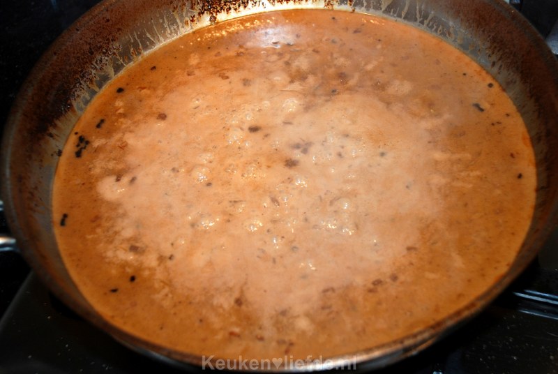 Kook dit voor ongeveer de helft in en roer dan de slagroom erdoor. Breng opnieuw aan de kook en zet dan het vuur laag. Laat de saus nog ongeveer 5-10 minuten zachtjes pruttelen.