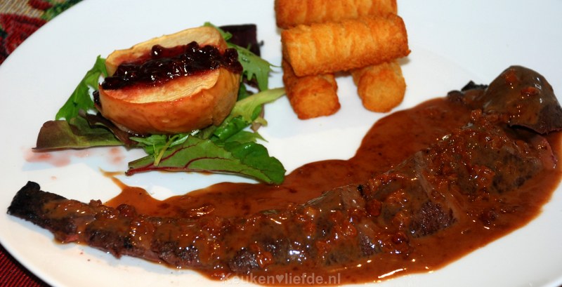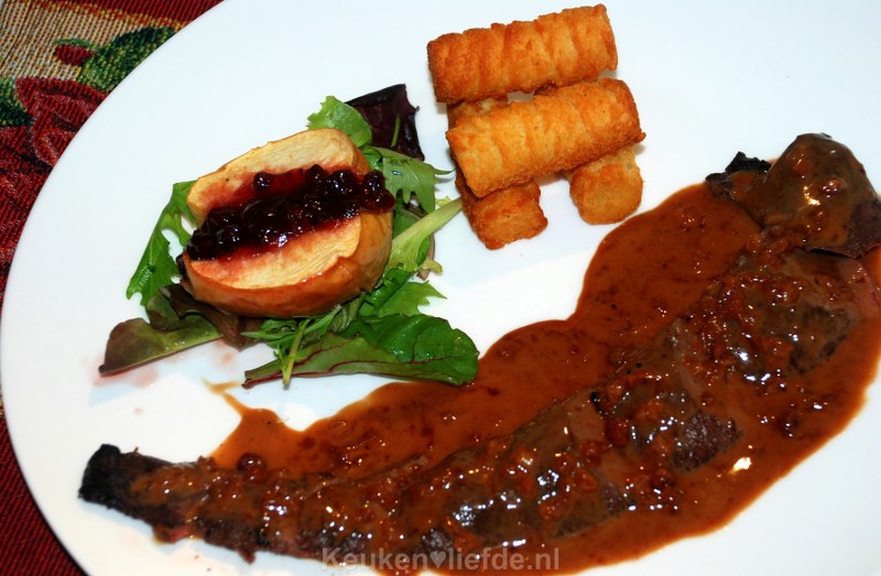 Dit is volgens mijn man het ultieme kerstgerecht; hazenrug met romige portsaus, met compote gevulde appel en krokante aardappelkroketjes. Voor twee personen is dit gerecht vrij eenvoudig te bereiden, maar wanneer je dit voor meerdere personen wilt maken is het wellicht handig om reeds van het bot gesneden hazenrugfilets te nemen.