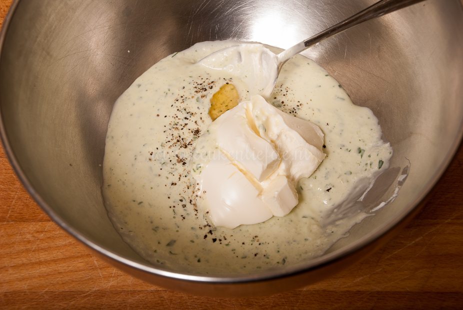 Doe de mayonaise, yoghurt, prei, peterselie en knoflook in de keukenmachine en mix tot een gladde saus. Doe de saus in een kom en klop de roomkaas erdoor.