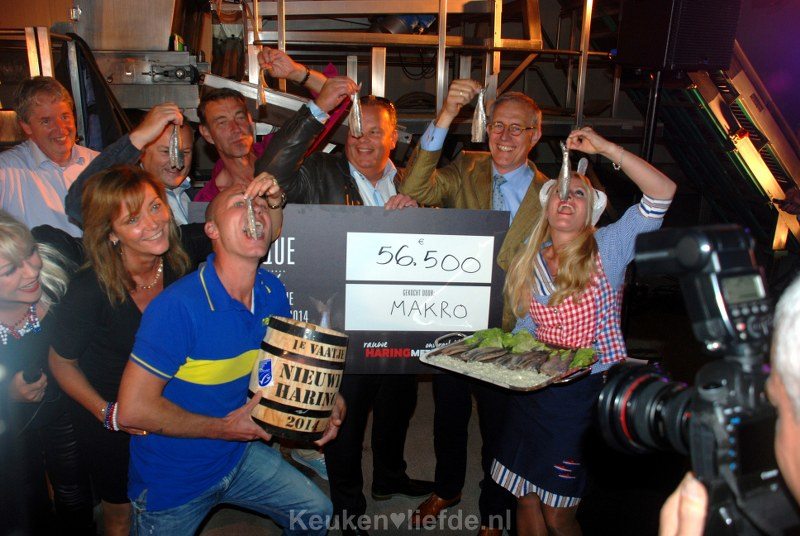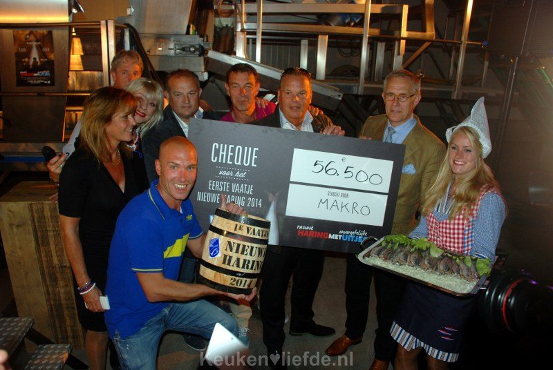De laatste 500 euro die het totaal op 56.500 euro bracht, werd geschonken door groothandel Makro, die daarmee het eerste vaatje Hollandse Nieuwe kocht.