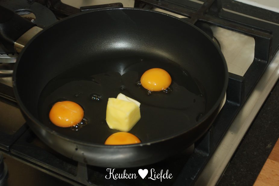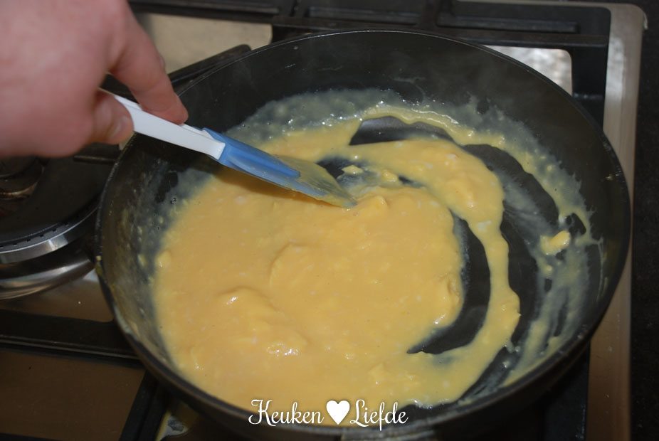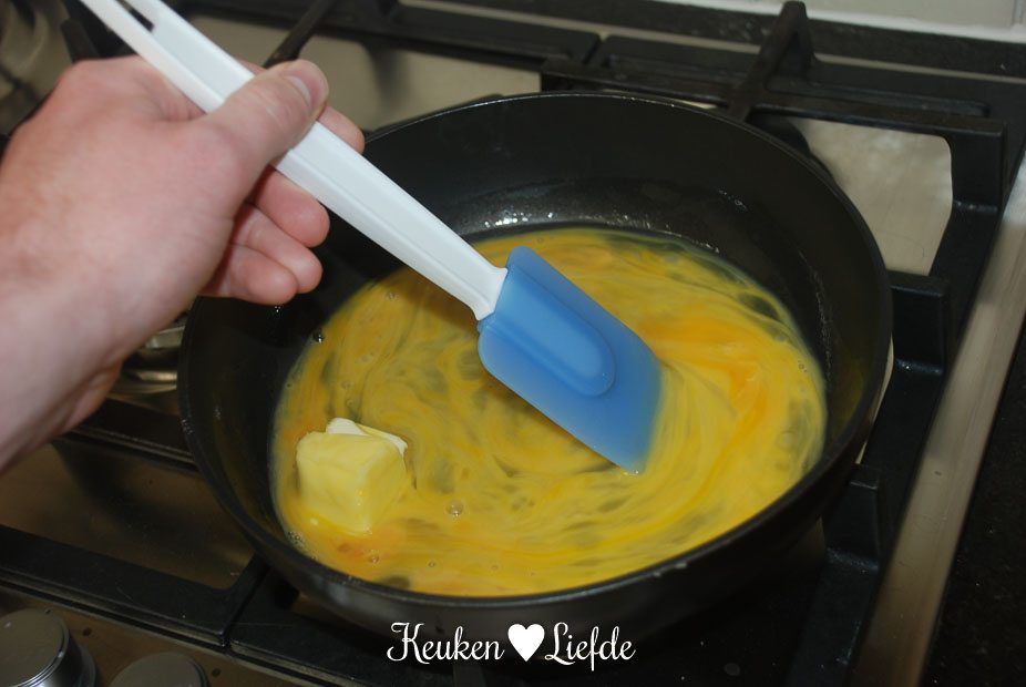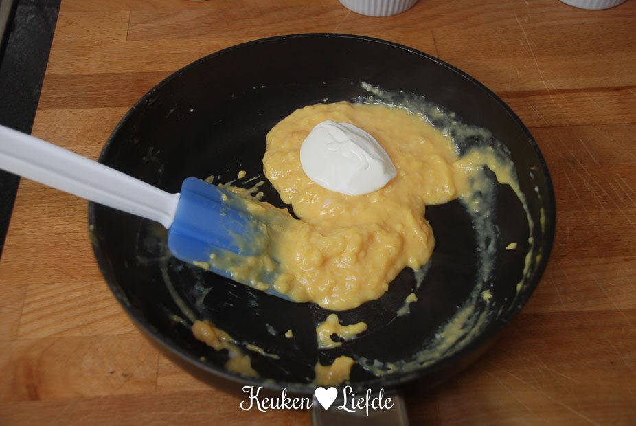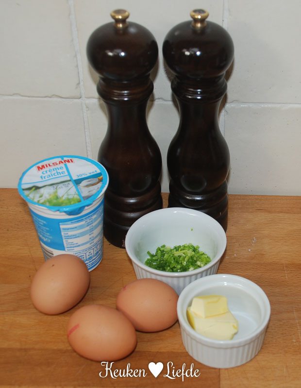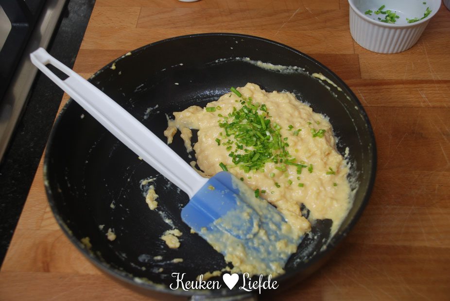 Doe de eieren en de boter in de pan en zet op laag vuur. Voeg zout en peper toe. Blijf continue zachtjes roeren en haal de pan steeds even van het vuur af als het ei te snel stolt. Door de restwarmte van de pan stolt het ei ook verder. De eieren zijn goed als ze nog licht vochtig zijn, smeuïg, romig en zacht. Roer als de eieren bijna goed zijn de crème fraîche en bieslook erdoor en breng eventueel nog verder op smaak met zout en peper.