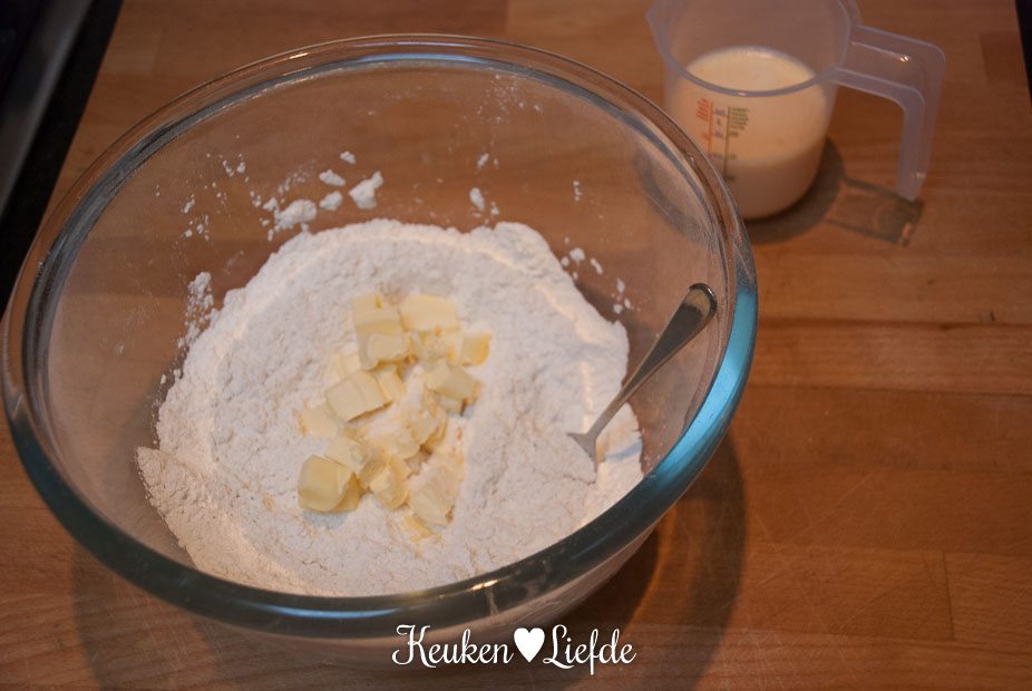 Zeef het bakmeel en de bakpoeder boven een kom en roer het zout en de suiker erdoor. Voeg de boter toe en kneed met je handen totdat de boter volledig is opgenomen.