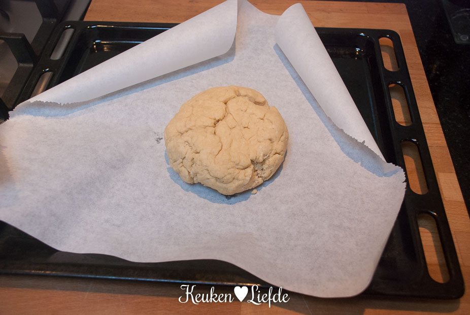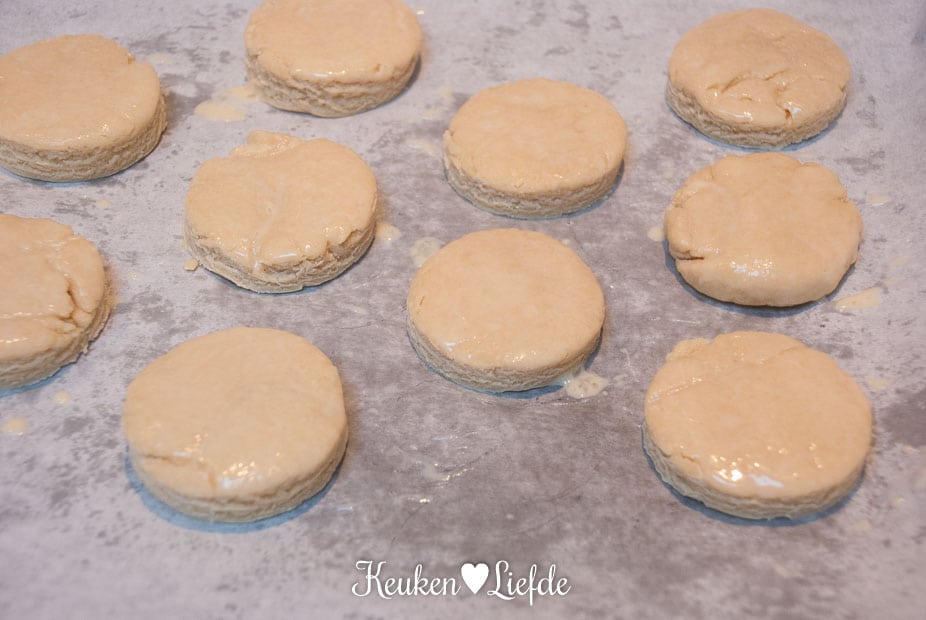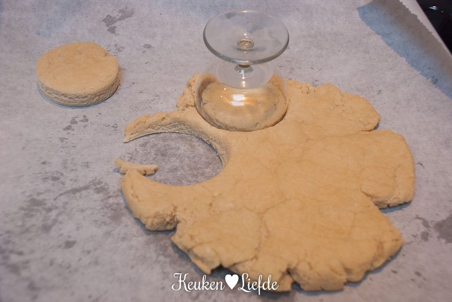Bekleed een bakblik met bakpapier en leg het deeg hierop. Druk met je handen het deeg plat totdat het circa 2,5 cm dik is. Steek er met een glas of kookring rondjes uit. Verzamel de restjes deeg, druk weer uit en steek er rondjes uit, totdat al het deeg op is.
