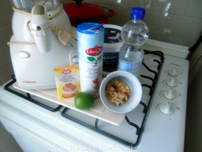Stamp 9 flinke ijsklonten tot gruis. Mix het met ca. 3 dl griekse yoghurt, 4 el poedersuiker, 2 dl ijskoud water en 1 zakje vanillesuiker.