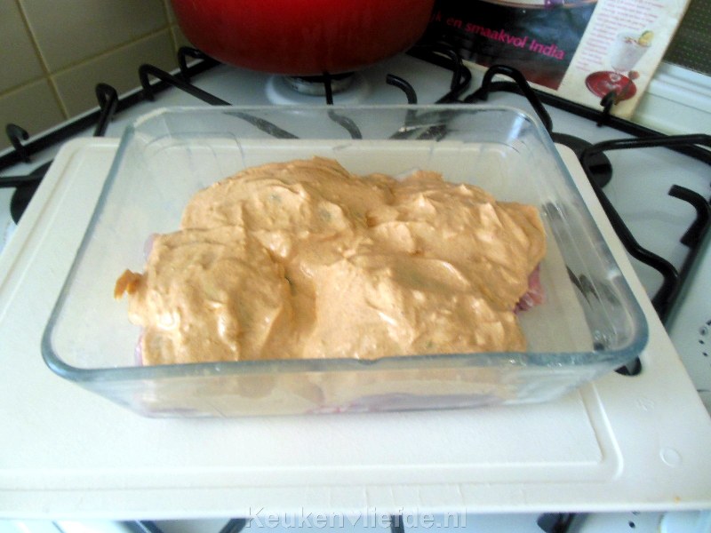 Bestrijk 1 kg kipdelen (ik gebruik meestal de kipbraadstukken zonder vel) met de marinade en laat ca. 4 uur in de koelkast intrekken.