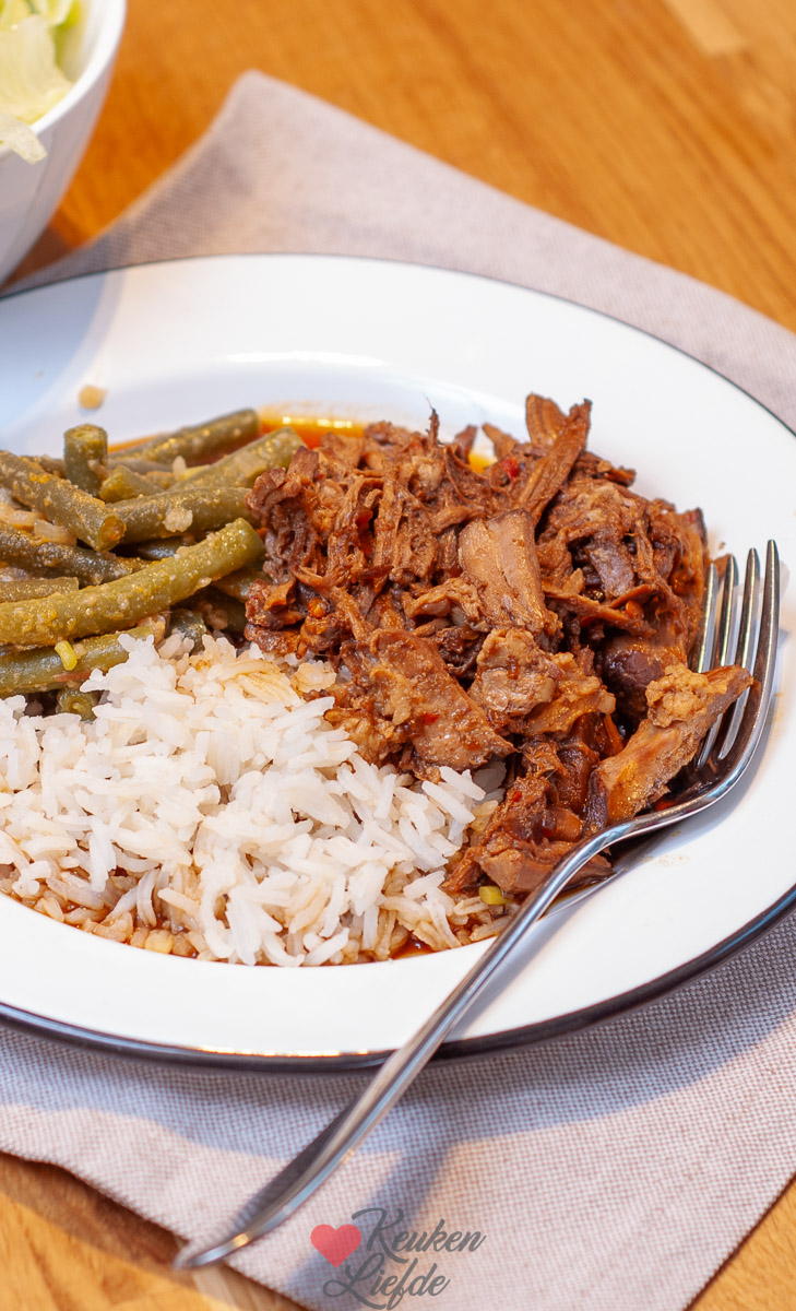 Malse pulled pork in ketjapsaus uit de slowcooker, geserveerd met rijst een boontjes.