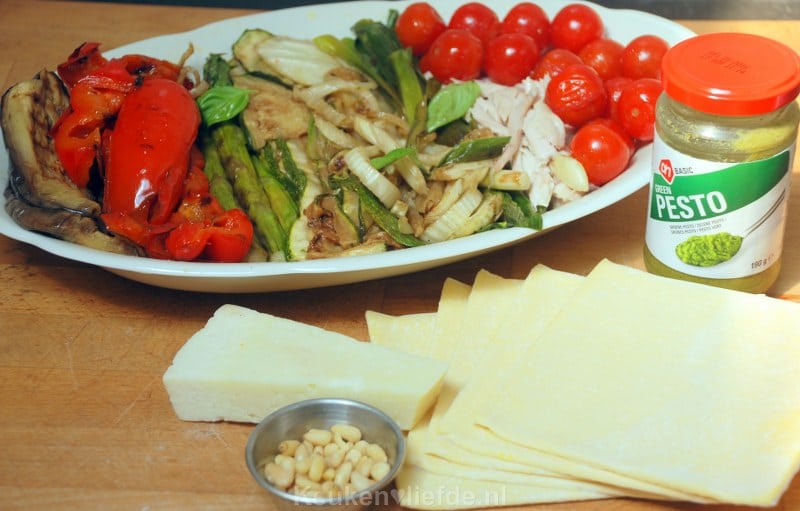 - 1/3 recept gegrilde groenten en eventueel een restje overgebleven kip