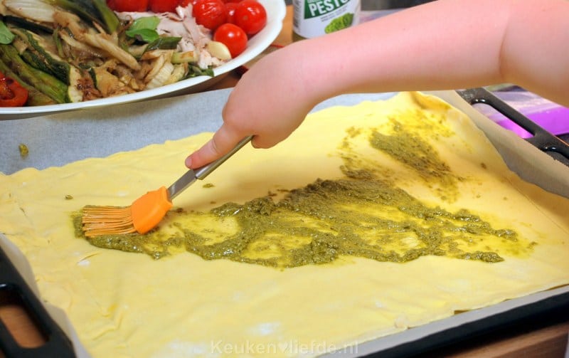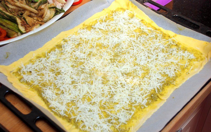 Leg de plakjes bladerdeeg op elkaar en rol ze, op een licht met bloem bestoven werkvlak, uit tot een grote vierkante lap. Leg de lap op een met bakpapier bekleed bakblik. Kerf het bladerdeeg rondom in met een mes, cica 2 cm van de rand af. Bestrijk het bladerdeeg binnen de rand met pesto en bestrooi royaal met de kaas.