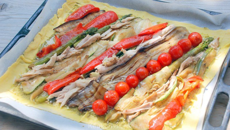 De lekkerste gerechten maak je met weinig en goede ingrediënten. Combineer wat bladerdeeg, gegrilde groenten, pesto en Parmezaan e qui; je serveert zomaar deze verrukkelijk smakende Italiaanse plaattaart!