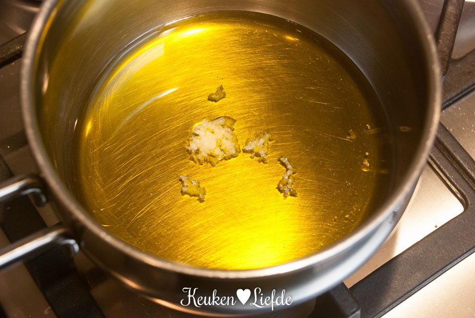 Verwarm — als de aardappels bijna gaar zijn — de olijfolie en knoflook in een klein steelpannetje op laag vuur, zodat de knoflooksmaak in de olie kan trekken. (Zet het vuur niet te hoog, anders verbrandt de knoflook en krijgt de olie een bittere smaak.)
