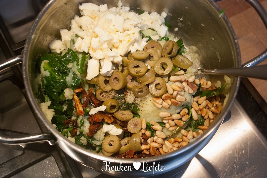 Voeg de spinazie en de knoflookolie toe aan de aardappelpuree en roer door, totdat de spinazie geslonken is. Roer dan alle overige ingrediënten door de puree en breng op smaak met zout en peper.