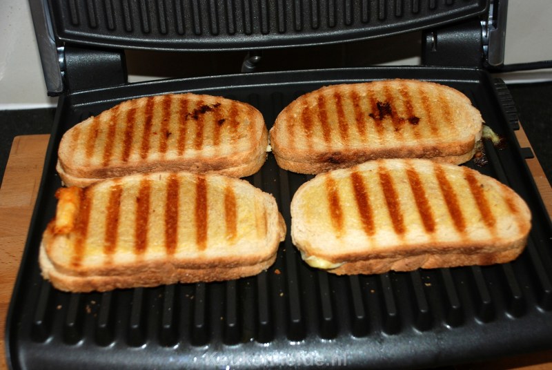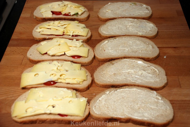 Smeer het brood aan de buitenkant in met wat smeerboter en rooster ze in een tostiapparaat of in de oven tot ze goudbruin zijn en de kaas gesmolten is.