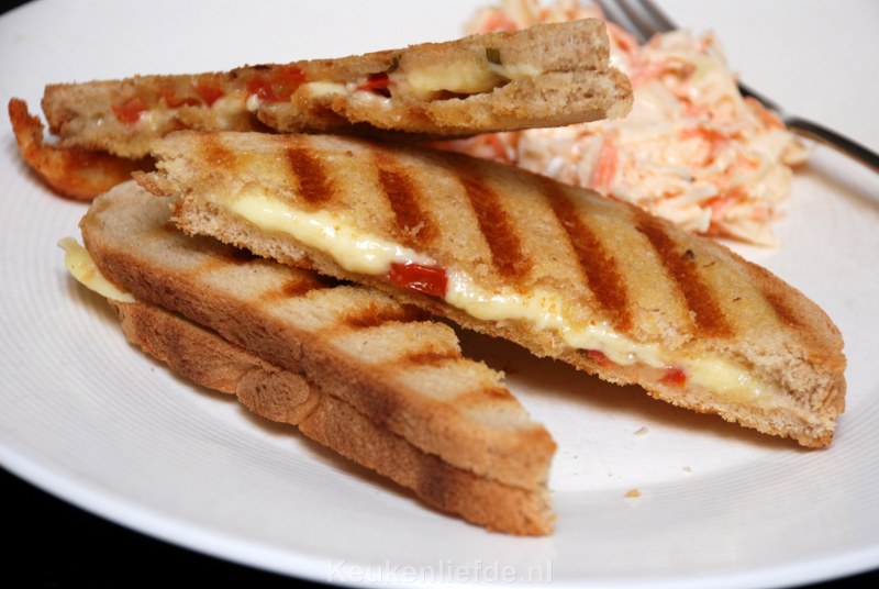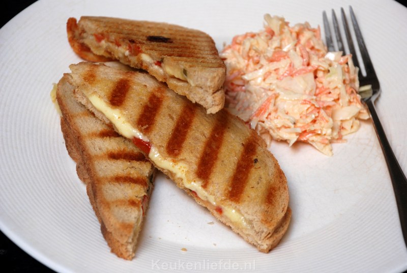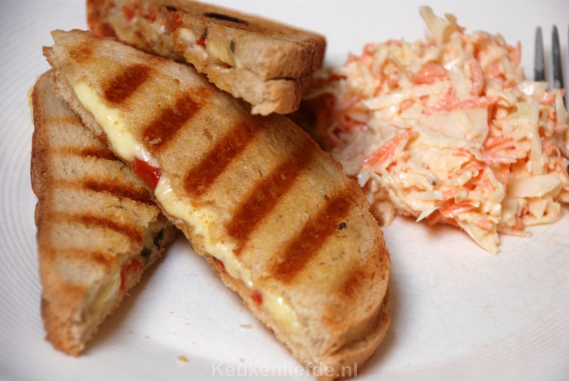Snijd de tosti’s diagonaal doormidden en serveer met een schepje coleslaw.