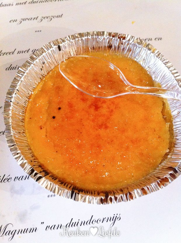Maar helaas. Mijn ogen waren – zoals gewoonlijk – weer eens groter dan mijn maag. Ik kon geen pap (of eigenlijk duindoorn) meer zeggen. Maar ik ben stoer. Ik ploeter me dapper door de amuses heen, die overigens fantastisch smaken.