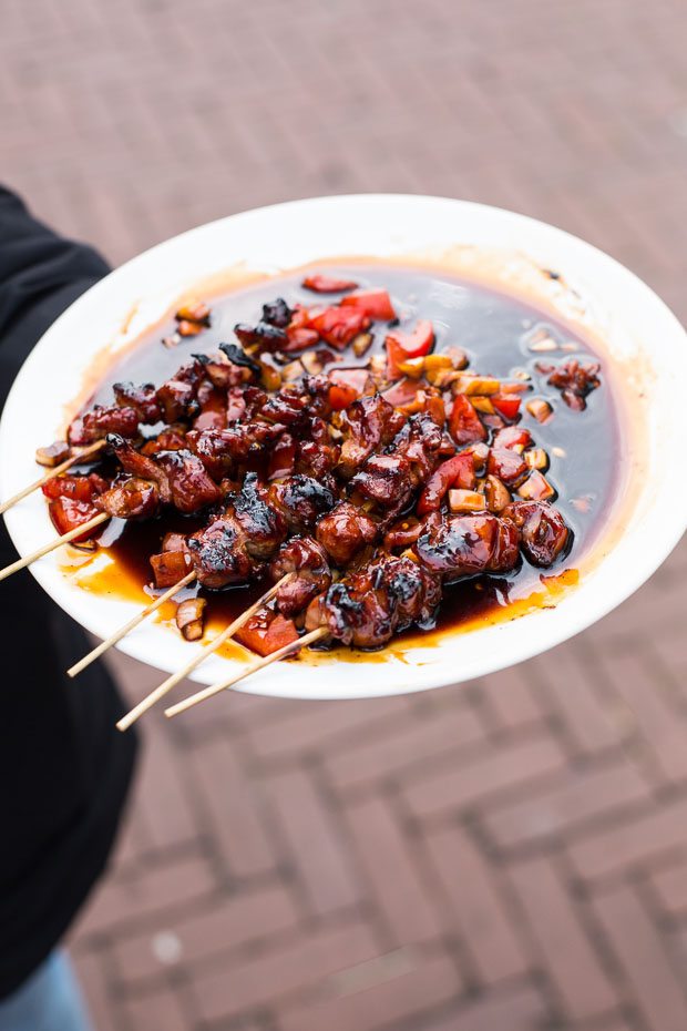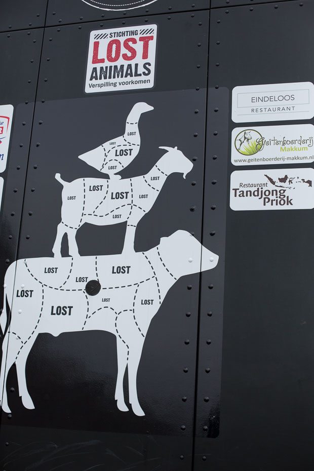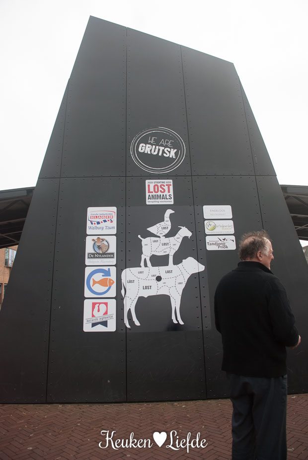 Tevens kun je hier vlees proeven van de Stichting Lost Animals (opgericht om knelpunten in de vleesketen te identificeren). Eén van de initiatiefnemers, chef-kok Ester Gerlofsma van Restaurant Tandjong Priok, bereidt ter plekke saté van geitenbokvlees op een houtskoolgrill.