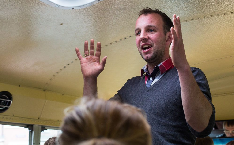 Volledig vol en volledig voldaan. Zo rijden we als verwende kinderen in onze schoolbus naar het laatste onderdeel van de dag: de food jamsessies in het Friesland College.