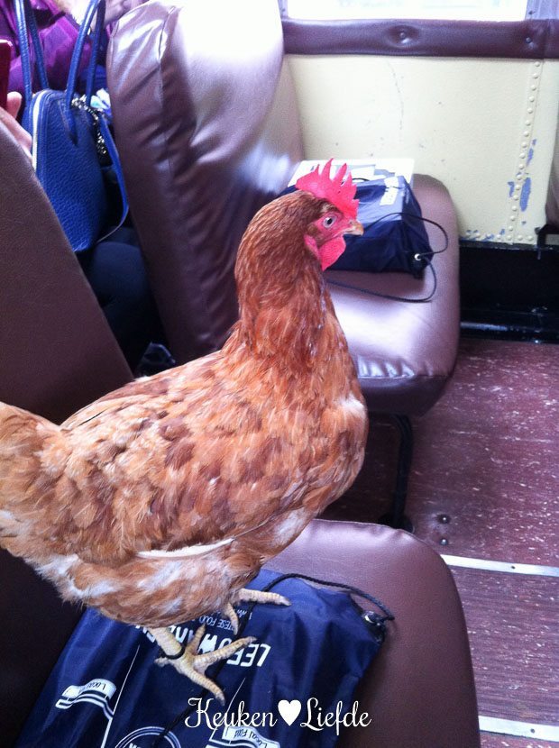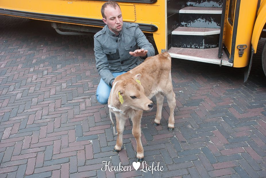 Voordat we vertrekken stapt boer Bart – samen met kalfje Wybe en kip Antoinette – bij ons in de bus.