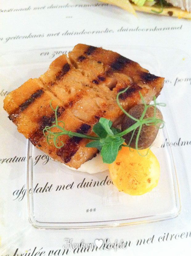 - Buikspek met bloemkoolmousseline, afgelakt met duindoornsiroop