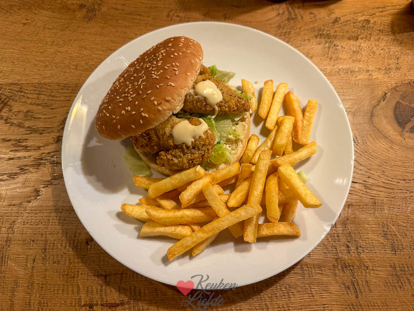 Een lekker broodje kipburger met chicken tenders van de Lidl (diepvries) en frietjes, en een gebakken kaasschnitzel met salade en krieltjes. En mijn moeder stuurde een foto door toen ze reibekuchen aan het bakken was. Hmmm, zo lekker.