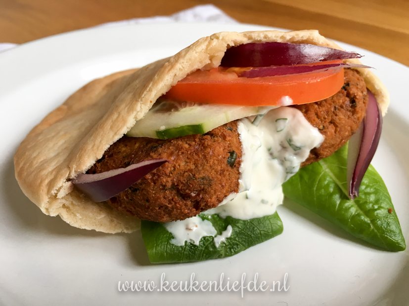Ik maak voor het eerst zelfgemaakte falafel. Stond al zo lang op mijn nog-te-koken-lijst! Ik maak ze op de traditionele manier van gedroogde kikkererwten die ik gisteren al in water heb ondergezet om ze te laten weken. Daarna pureer je ze samen met wat lekkere smaakmakers en draai je er kleine balletjes, of mini hamburgers van. En je frituurt ze. Je kunt ze op verschillende manieren serveren (bijvoorbeeld als borrelhapje met hummusdip, of in een salade met couscous), maar ik stop ze in een pitabroodje met salade en yoghurtsaus.