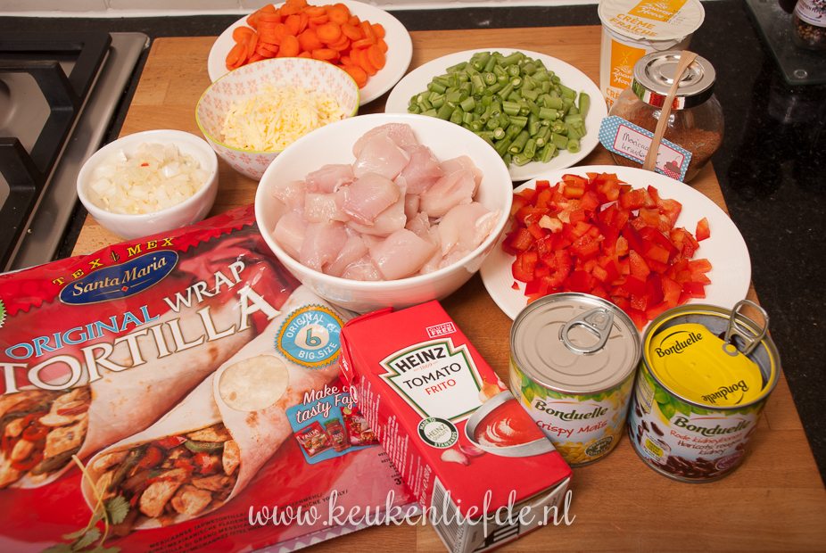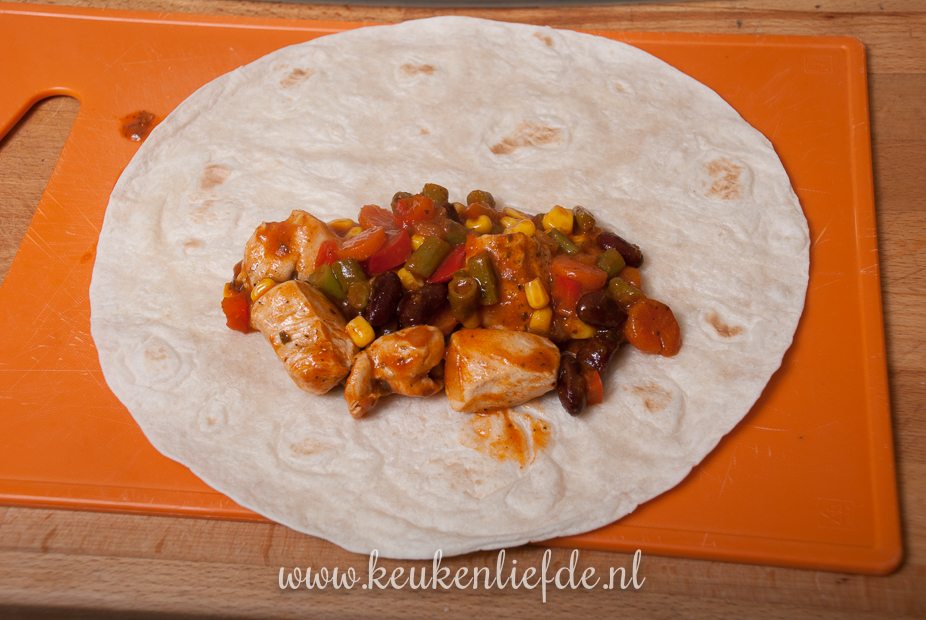 Als vulling voor de wraps gebruik ik een combinatie van kip en verse groenten zoals wortel, sperzieboontjes en paprika. De maiskorrels en kidneybonen uit blik geven tot slot een heerlijk Mexicaans tintje.
