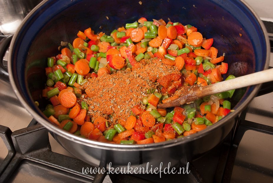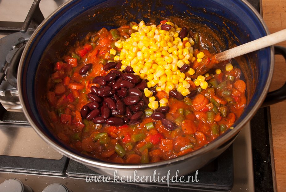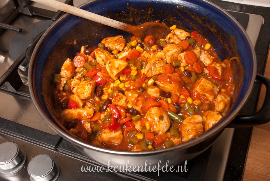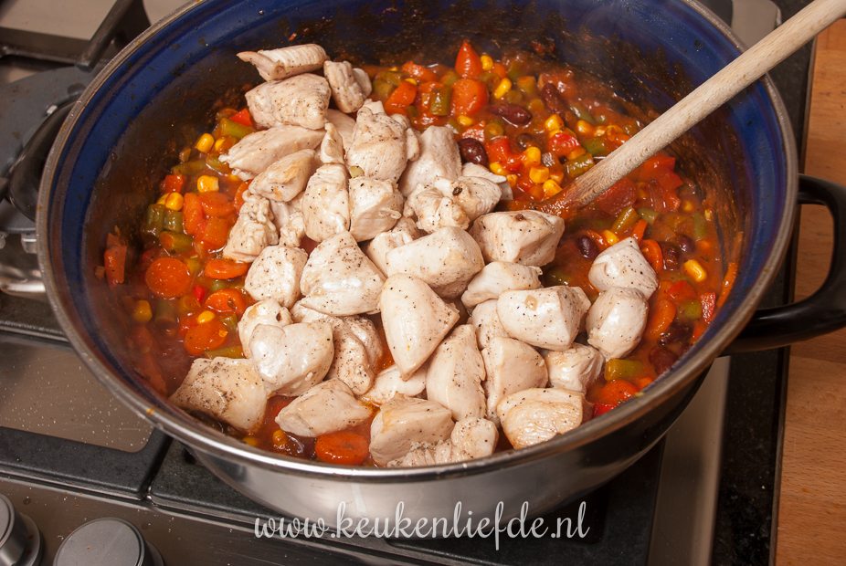 Doe indien nodig wat extra olie in de pan en voeg de ui, knoflook, wortel, sperziebonen en paprika toe. Breng op smaak met peper en zout. Bak een minuut op middelhoog vuur en voeg dan de Mexicaanse kruiden toe. Bak kort mee. Voeg de tomaten frito, mais, kidneybonen en een glas water toe en smoor de groenten op middelhoog vuur, totdat ze beetgaar zijn. Voeg steeds wat extra water toe als de saus te dik wordt en de groenten nog niet gaar zijn. Voeg, als de groenten beetgaar zijn, de kip weer toe aan de saus en roer even door. Zet het vuur uit.