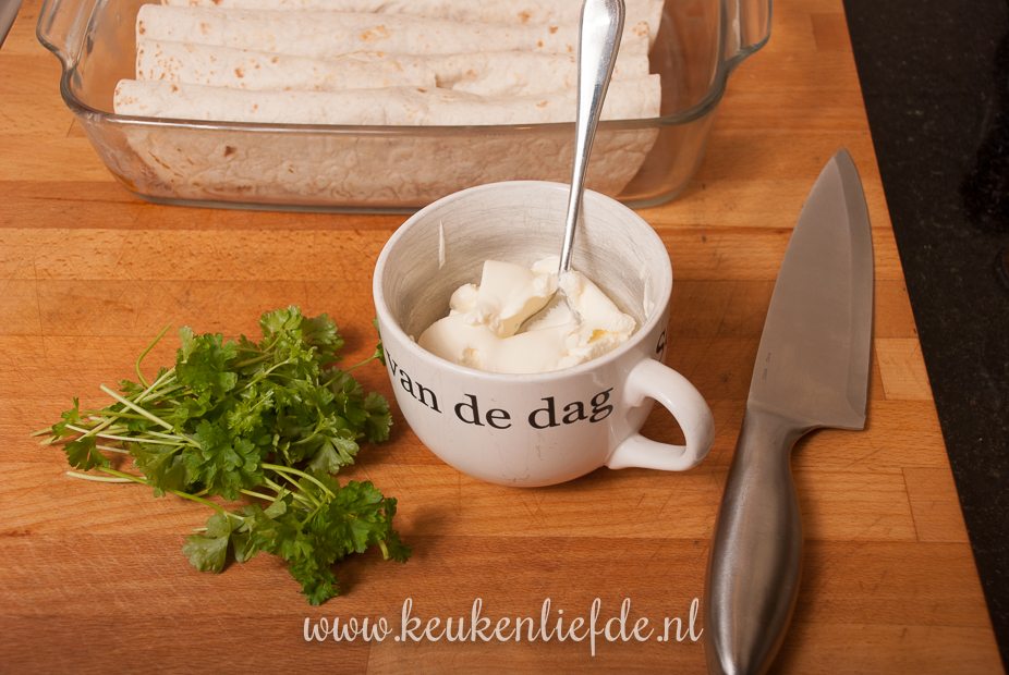 Roer in een kommetje de crème fraîche los met de peterselie — houd wat peterselie achter voor garnering. Bestrijk de bovenkant van de wraps met de crème fraîche en bestrooi met geraspte kaas.