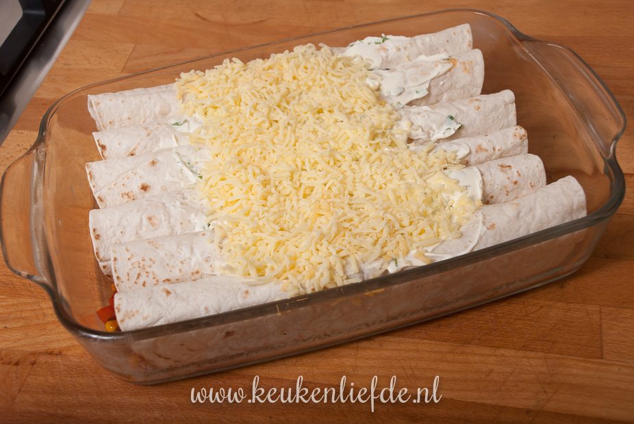 Verwarm de oven voor op 200 graden. Vet de ovenschaal in met wat olie. Schep wat kipvulling op een tortilla en rol hem strak op. Leg in de ovenschaal. Herhaal dit totdat alle ingrediënten op zijn.